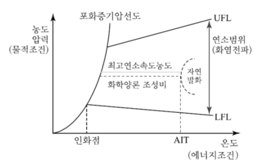 - AIT (Auto-Ignition Temperature, 자연 발화 온도): 외부 점화원 없이 스스로 발화할 수 있는 온도를 의미하며, 온도가 이 이상으로 올라가면 가연성 물질이 자연 발화할 수 있습니다.